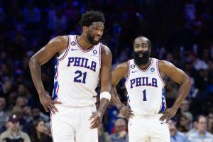 在常规赛赛场上,哈登和恩比德一共对决过10次,两人各自赢下5次。
