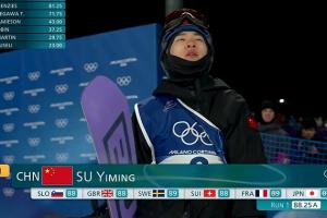 单板滑雪男子大跳台决赛:苏翊鸣第一跳88.25分,暂排第二