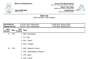 米兰冬奥会短道速滑混合接力1/4决赛分组:中国与加拿大同第三组
