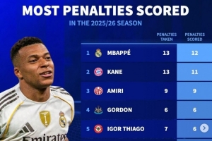 体育资讯2月10日讯 《转会市场》统计了本赛季五大联赛球员点球进球情况,姆巴佩力压凯恩居首。