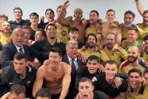 巴萨官方社媒晒出全队在更衣室内合影并庆祝的视频,配文:“冠军,冠军!”