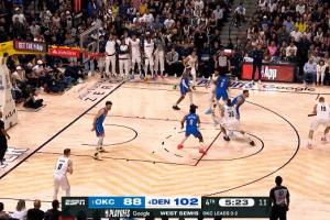 此举达成两个目的,1、是消耗了7秒;2、是让雷霆去中圈发球(如果约老师不碰球,那雷霆就会在底线发球,离掘金的篮筐更近、威胁更大。)