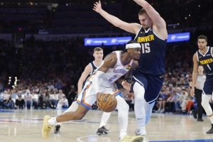 雷霆给出的办法是抓底线。从底角三分到底线空切,这一条线其实是掘金防守布阵的薄弱环节。兵力都往中路堆,漏底角本是普遍现象。掘金在联防的时候,能出现在护筐位置的又往往只有约基奇,而约基奇通常不会陪犯规给占据有利位置的空切球员,那么球能给到底线附近的队友,就很有机会偷篮下。G5雷霆这个思路显然是执行成功的。