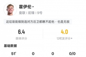 体育资讯5月17日讯 英超第37轮焦点战,曼联客战切尔西,上半场两队暂0-0战平。霍伊伦首发出战,半场0射门,0过人,3次地面对抗均失败,评分6.4。