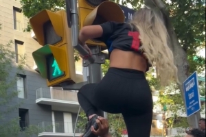 游行时,拉菲尼亚的妻子娜塔莉亚更新社媒晒出一段视频,自己在其他人帮助下想爬上红绿灯但失败了。