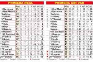 体育资讯05月19日讯 目前,巴萨领先皇马4分,已经提前获得西甲冠军。阿斯报发文,假设了在没有VAR情况下本赛季西甲的积分榜排名。皇马将8分领跑夺冠。