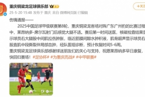 铜梁龙官方写道:2025中国足球甲级联赛第8轮,重庆铜梁龙客场对阵广东广州豹的比赛过程中,莱昂纳多-席尔瓦射门后感觉大腿不适。赛后第一时间送医,核磁检查结果显示球员右大腿股中间肌拉伤肿胀,临近筋膜间隙水肿积液,肌骨超声显示球员右侧股直肌中段撕裂伴局部血肿,经队医组诊断,预计恢复时间5-6周。