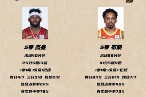 赛后,CBA官方发布了本场比赛的数据报告,如图所示,广厦在三个区域的投篮命中率都优于北京,杰曼和布朗分别当选两队最佳球员。