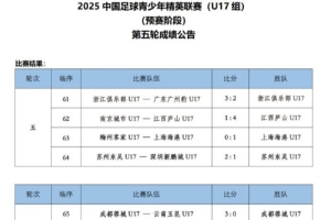 体育资讯5月21日讯 2025中国足球青少年精英联赛(U17组)预赛阶段第5轮已经结束,本轮恒大足校、武汉三镇U17、泰山U17B队均以6-0的比分大胜对手。