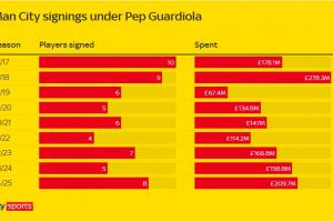 而本赛季的引援花费则超过了2亿英镑,这一数字排在瓜迪奥拉任内的第二位,仅次于17/18赛季的2.783亿英镑。