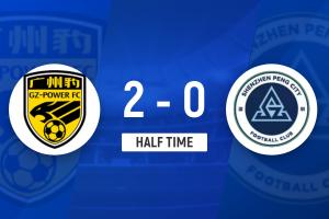 上半场伤停补时2分钟,半场结束,广东广州豹暂2-0深圳新鹏城。