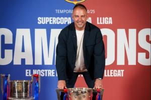 本赛季,弗里克执教巴萨赢得西甲、国王杯和西班牙超级杯三座国内冠军,欧冠闯入四强,截至目前带队59场比赛,战绩43胜7平9负。