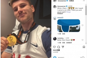维尔纳社媒晒出手拿奖牌的照片,并写道:“多么棒的球队!就像我说过的那样,我是来拿冠军的。感谢大家,晚安。”
