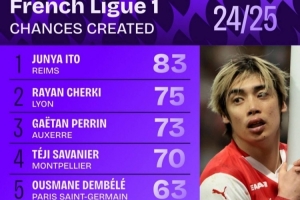 其中效力于兰斯的日本快马伊东纯也以83次位居榜首,切尔基和盖坦-佩兰分别以75次和73次位列二三位,登贝莱63次排在第5,李刚仁57次排第6。