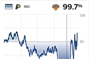 本场比赛第四节末段,尼克斯拿下比赛的胜率一度高达99.7%,但哈利伯顿在常规赛最后时刻踩着三分线完成绝平,最终尼克斯加时不敌对手!