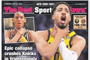 赛后,《纽约邮报》体育将哈利伯顿和雷吉-米勒的掐喉瞬间设置为头版,并写道:“掐喉2.0版本。尼克斯惨遭史诗级崩盘。”