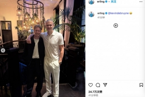 体育资讯5月23日讯 当地时间本周四,曼城前锋哈兰德在个人INS上发图,晒出了与德布劳内的合影。