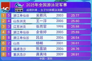 吴卿风在决赛中游出了25秒77的成绩夺冠,王一淳25秒80获得亚军,张雨霏25秒88拿到铜牌,余依婷25秒89获得第四。这四人的成绩全部达到世锦赛A标。
