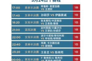 体育资讯5月24日讯 多哈世乒赛今天将继续展开争夺,孙颖莎和王楚钦将在混双项目冲击三连冠。此外,王楚钦、孙颖莎、王曼昱、陈幸同、梁靖崑还将出战单打半决赛的比赛。女双赛场,王曼昱搭档蒯曼冲击一张决赛门票。