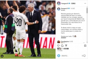 体育资讯5月24日讯 皇马主帅安切洛蒂今夏离任,弗兰-加西亚更新社媒动态,与安帅告别。