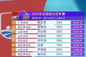 汪顺预赛中游出了4分25秒76的成绩,陶冠男4分23秒10排名第一晋级,顾恩翊4分23秒30排名第二。