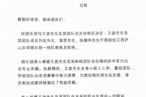 俱乐部衷心感谢王波先生及其教练团队在任期间的辛苦付出与专业贡献。执教期间,王波先生全身心投入工作、重组团队,带领球队在各项赛事中努力拼搏,为推动俱乐部长远发展、谋求竞技成绩突破做出了有益贡献。