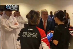 巴赫在索林等人的陪同下先是看了两场男双比赛,随后在参观体育馆时,来到检录区和正在挑球的中国选手陈幸同互动交流。