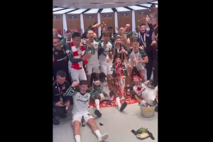 桑德兰官方社媒发布视频,球员在更衣室内庆祝晋级,桑德兰社媒写道:庆祝时间🕺