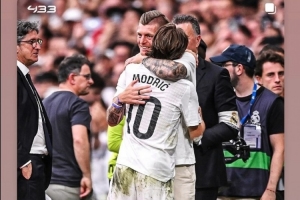 西甲最后一轮比赛,莫德里奇首发出战,皇马主场2-0击败皇家社会。莫德里奇将在世俱杯后离队,此役是他在伯纳乌的告别战。莫德里奇被换下时泪洒赛场,并与已经退役的老队友克罗斯拥抱。