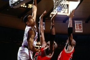 体育资讯5月25日讯 32年前的今天,1993年5月25日,东部决赛G2,尼克斯主场对阵公牛,在比赛还剩46秒的时候,尼克斯91-88领先公牛,尼克斯后卫、绰号“疯子”的约翰-斯塔克斯沿着底线突破,隔着乔丹和霍勒斯-格兰特,用左手把球飞身扣进篮筐。