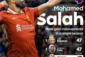 据统计,萨拉赫本赛季英超直接参与47粒进球(29球18助),追平了希勒与科尔共同保持的单赛季英超历史纪录,他也是首位在38场英超做到这一点的球员。