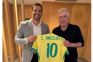 巴西足协主席萨乌德接待安切洛蒂,两人手拿印有安切洛蒂名字的巴西10号球衣合影。