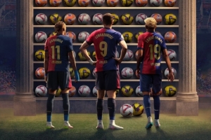 巴萨官方社媒晒出西甲赛季102粒进球海报,莱万、拉菲尼亚、亚马尔三叉戟出镜。