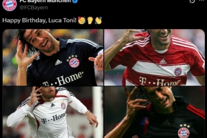 体育资讯5月26日讯 今天是前意大利国脚卢卡-托尼48岁生日,拜仁官推晒出球员标志性庆祝动作为其送上生日祝福。