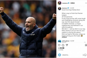 切尔西主帅马雷斯卡社媒晒出多张照片,并写道:“早上好,切尔西球迷们!我们以多么棒的方式结束了本赛季的英超联赛。20场胜利/20张照片。