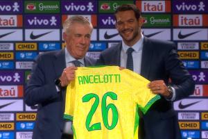 体育资讯5月27日讯 巴西国家队新闻发布会,安切洛蒂首次亮相,他接受了媒体人的采访。