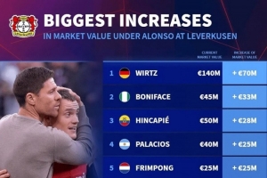 体育资讯5月27日讯 德国转会市场统计了阿隆索执教勒沃库森期间,队内球员德转身价的上涨金额,并列出榜单,维尔茨上涨7000万欧最多。