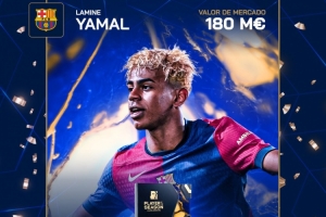 体育资讯5月28日讯 德国转会市场网宣布,亚马尔被用户票选为本赛季西甲最佳球员。