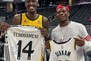 体育资讯5月28日讯 不久前,皇马中场琼阿梅尼更新了社交媒体,晒出了自己与步行者球星西亚卡姆交换球衣的合照。