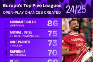体育资讯5月29日讯 Squawka统计了本赛季球员在五大联赛运动战中创造机会的次数,并列出榜单,萨拉赫86次居首,奥利塞、帕尔默二三位。