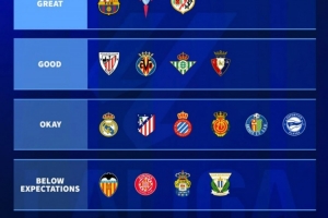 体育资讯5月29日讯 本赛季西甲战罢,德转也为本赛季西甲球队表现做出评级,具体如下:
