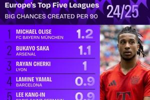 体育资讯05月29日讯 Squawka统计了本赛季球员在五大联赛每90分钟创造绝佳机会的次数,奥利塞每90分钟1.2次居首,萨卡、切尔基分列2、3,亚马尔第四。