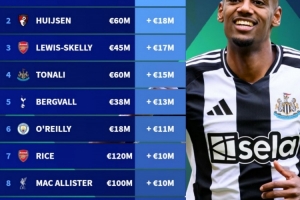 体育资讯5月30日讯 德转今日更新了英超球员身价,并盘点了此次更新身价涨幅榜,其中伊萨克居首,具体如下: