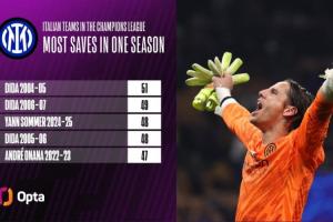 意大利球队欧冠单赛季扑救次数排行