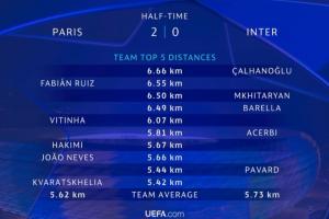 体育资讯06月01日讯 欧冠决赛巴黎半场2-0领先国米,半场跑动数据出炉。