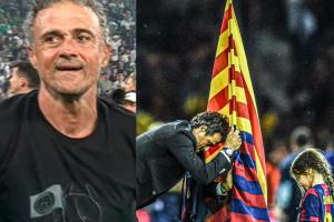 恩里克T恤上的卡通图案是2015年巴萨夺得欧冠时,恩里克与女儿举旗的名场面,只不过旗子换成了巴黎队徽。