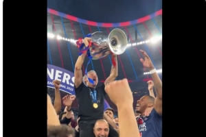 体育资讯6月1日讯 欧冠决赛,巴黎5-0击败国米,捧起冠军奖杯。