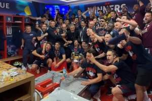 巴黎主帅恩里克赛后与球员们一起在更衣室内庆祝夺冠并合影,巴黎官方社媒晒出视频,配文:“我们是冠军!”