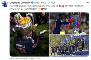 赛后登贝莱更新社媒写道:这不再是梦想,欧洲冠军!!!我们一起书写历史,巴黎加油!