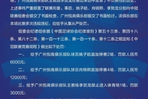 体育资讯6月1日讯 据中冠官方消息,对广州悦高俱乐部总计罚款4.1万元。